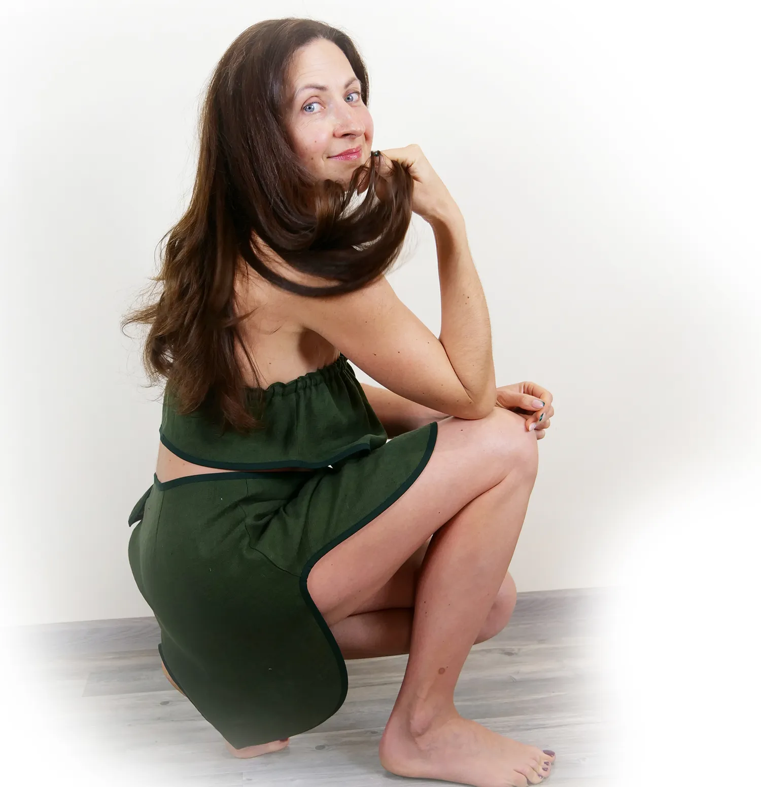 moteriškas-lininis-pirties-kostiumėlis-chaki-priepirtis-dizainas